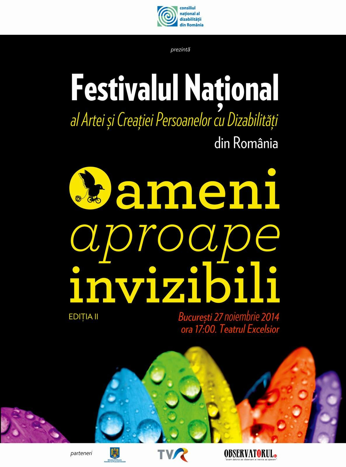 Joi, 27 noiembrie, la Teatrul Excelsior din Bucureşti, va avea loc cea de-a doua ediţie a Festivalului–concurs “Oameni aproape invizibili”, primul festival al artei şi creaţiei persoanelor cu dizabilităţi, iniţiat şi organizat de Consiliul Naţional al Dizabilităţii din România (www.fcndr.ro).