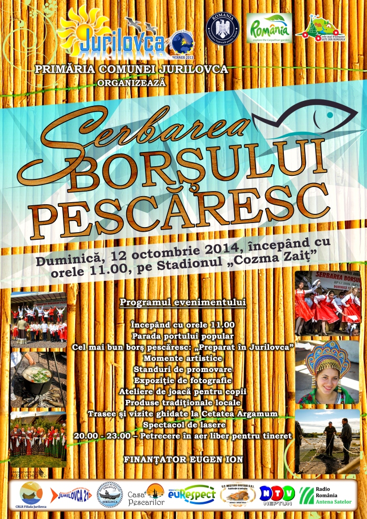 Şi anul acesta ne regăsim printre partenerii Serbării Borşului Pescăresc de la Jurilovca, localitate ce are statut de Destinaţie Europeană de Excelenţă. Primăria comunei Jurilovca vă prezintă oferta: 20 de ceaune pentru borșul pescăresc, 700 kg de pește, 8 ore de
